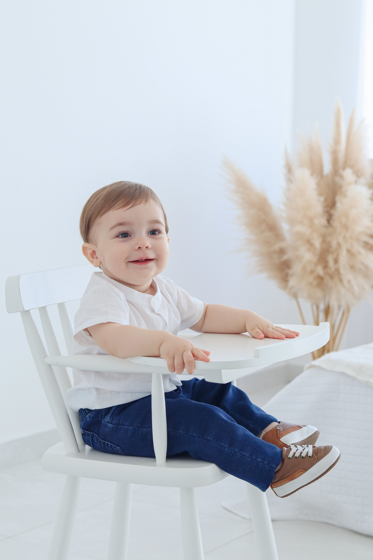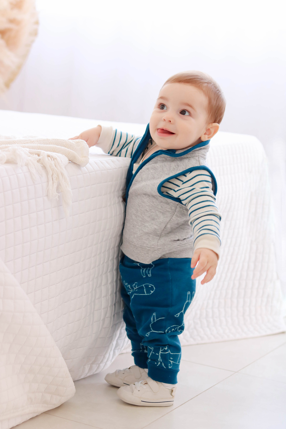 Perto de completar o primeiro aninho, entre 9 e 12 meses, realizamos o último ensaio de acompanhamento. Nesta fase, a criança já engatinha e começa a ficar em pé sozinha, se apoiando em bancos, mesas e outras superfícies.